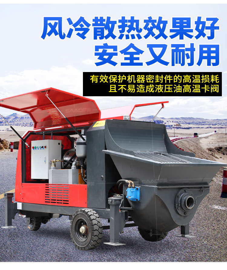 采用獨創的泵車尾輪驅動系統輕松解決移動時帶來的各種困難;采用雙排風冷散熱系統散熱效果更好,液壓系統采用壓力更高,性能更穩定的柱塞式自動變量主油泵,采用先進的三維立